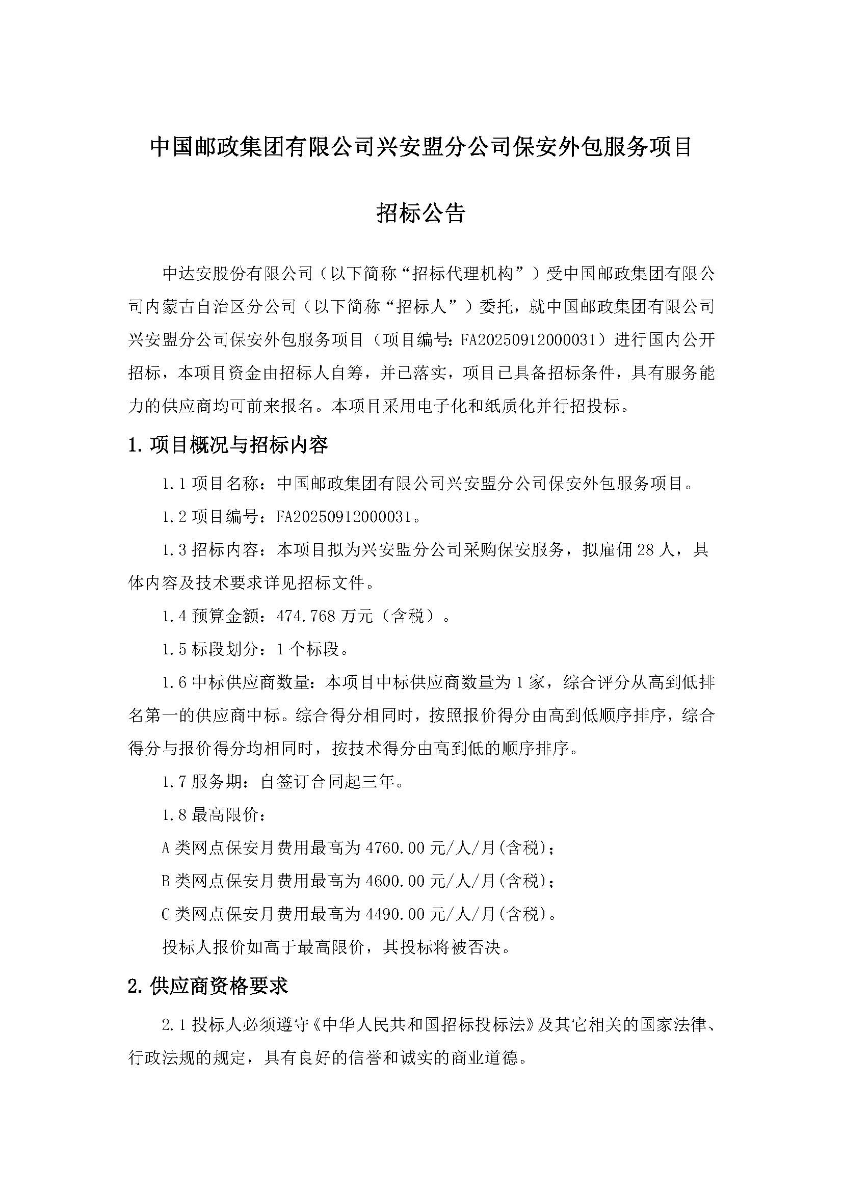 中國郵政集團有限公司興安盟分公司保安外包服務(wù)項目招標公告