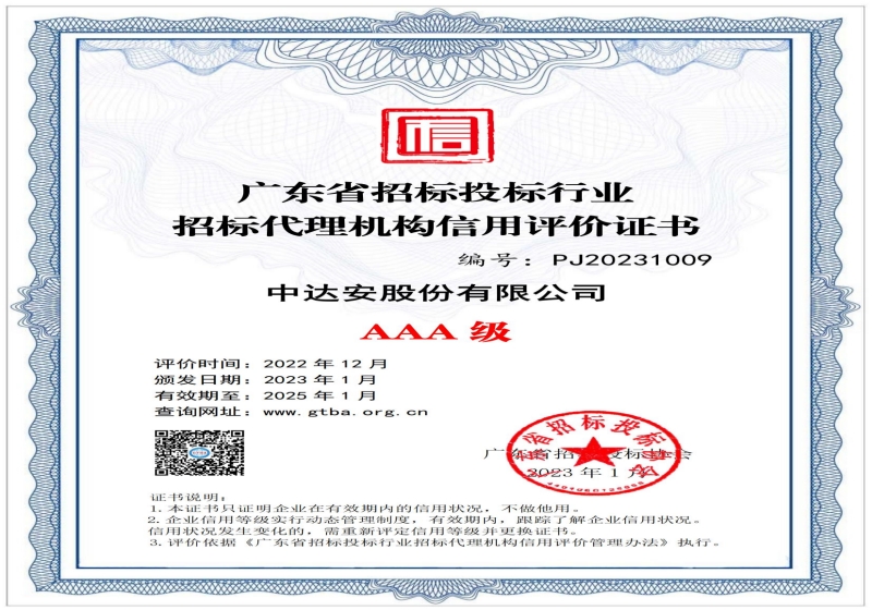 廣東省招標(biāo)投標(biāo)行業(yè)招標(biāo)代理機(jī)構(gòu)信用評(píng)價(jià)AAA級(jí)證書